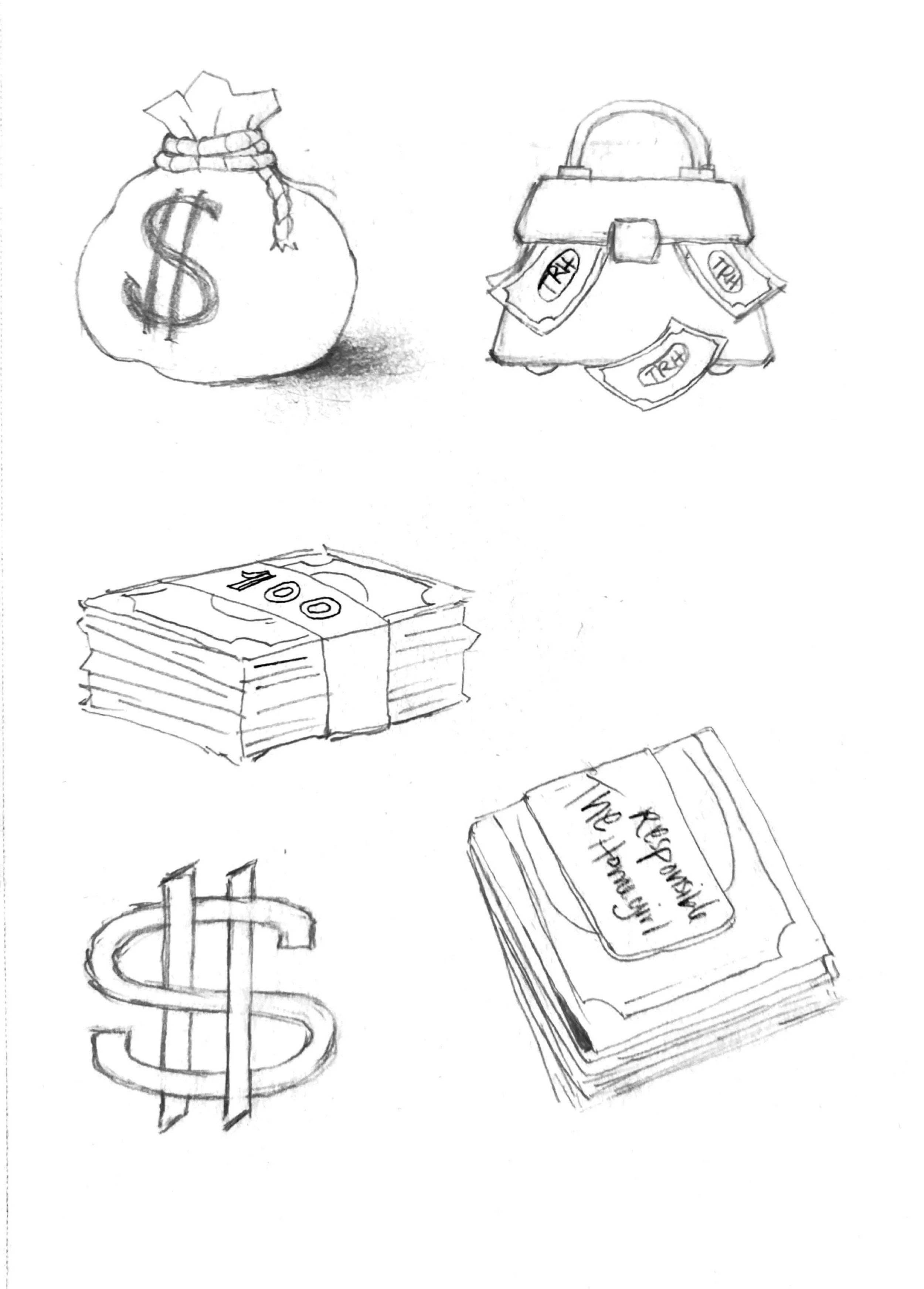 Icons like the dollar bag, purse, money tree, gold grill, and stacks of cash