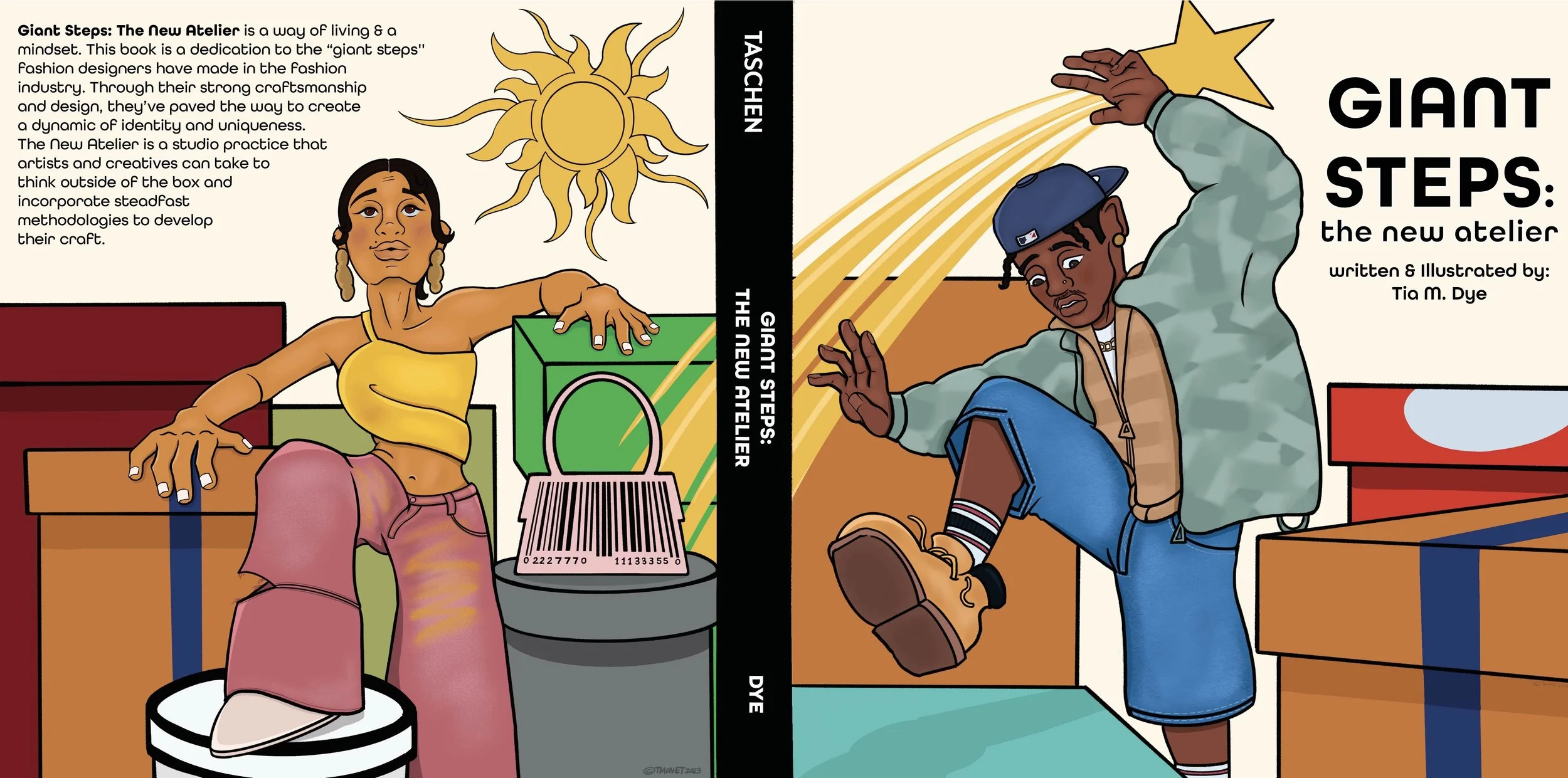 The book jacket’s playful exaggeration of scale, symbolic props, and energetic poses echo the traditions of fashion illustration while infusing them with the dynamism of comic-inspired character art. In fusing the elegance of runway aesthetics with the kinetic energy of pop culture icons, GIANT STEPS sits at the crossroads of Afrofuturistic optimism, streetwear authenticity, and editorial fantasy.