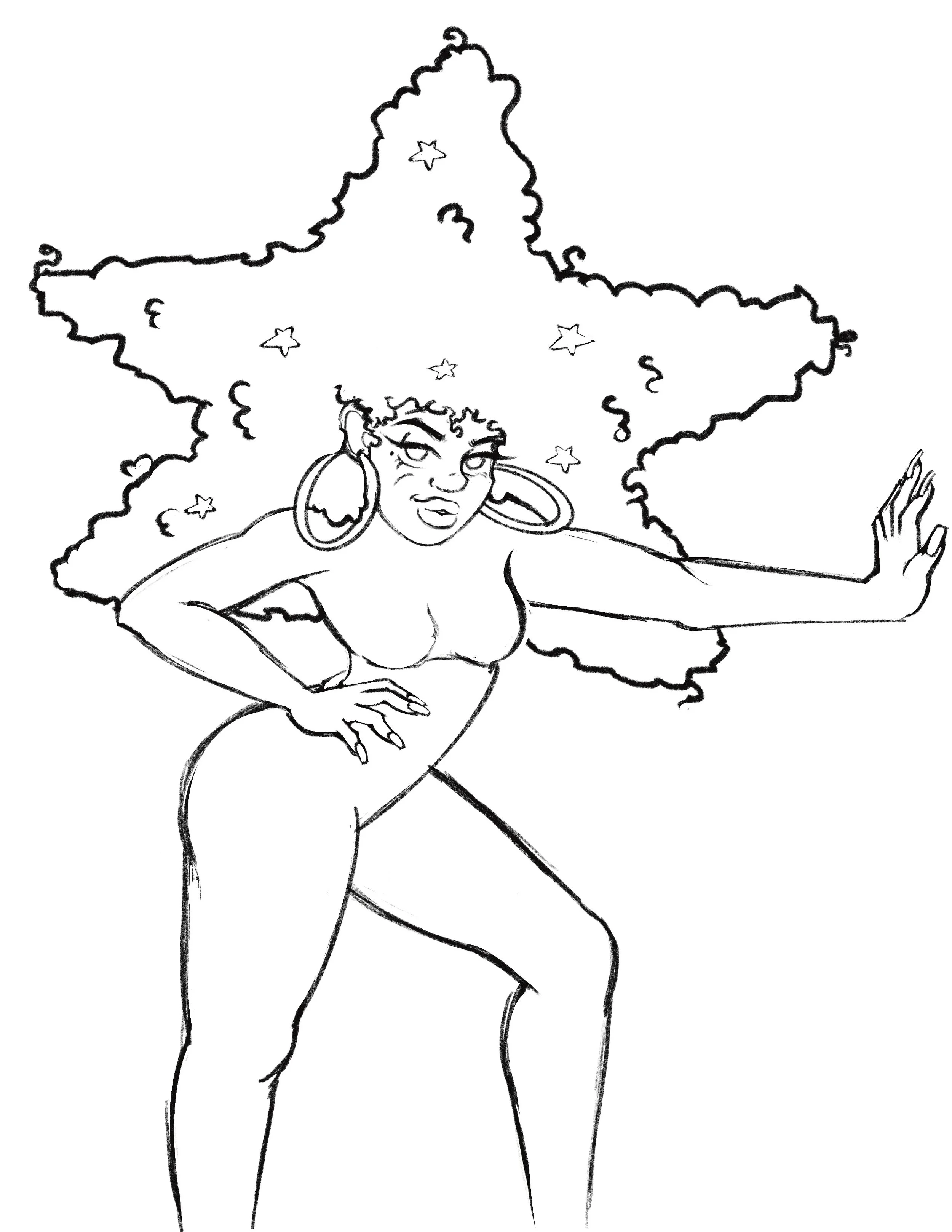Strong contour lines define Starlita’s silhouette and outfit details (boots, tube top, belt, nails)